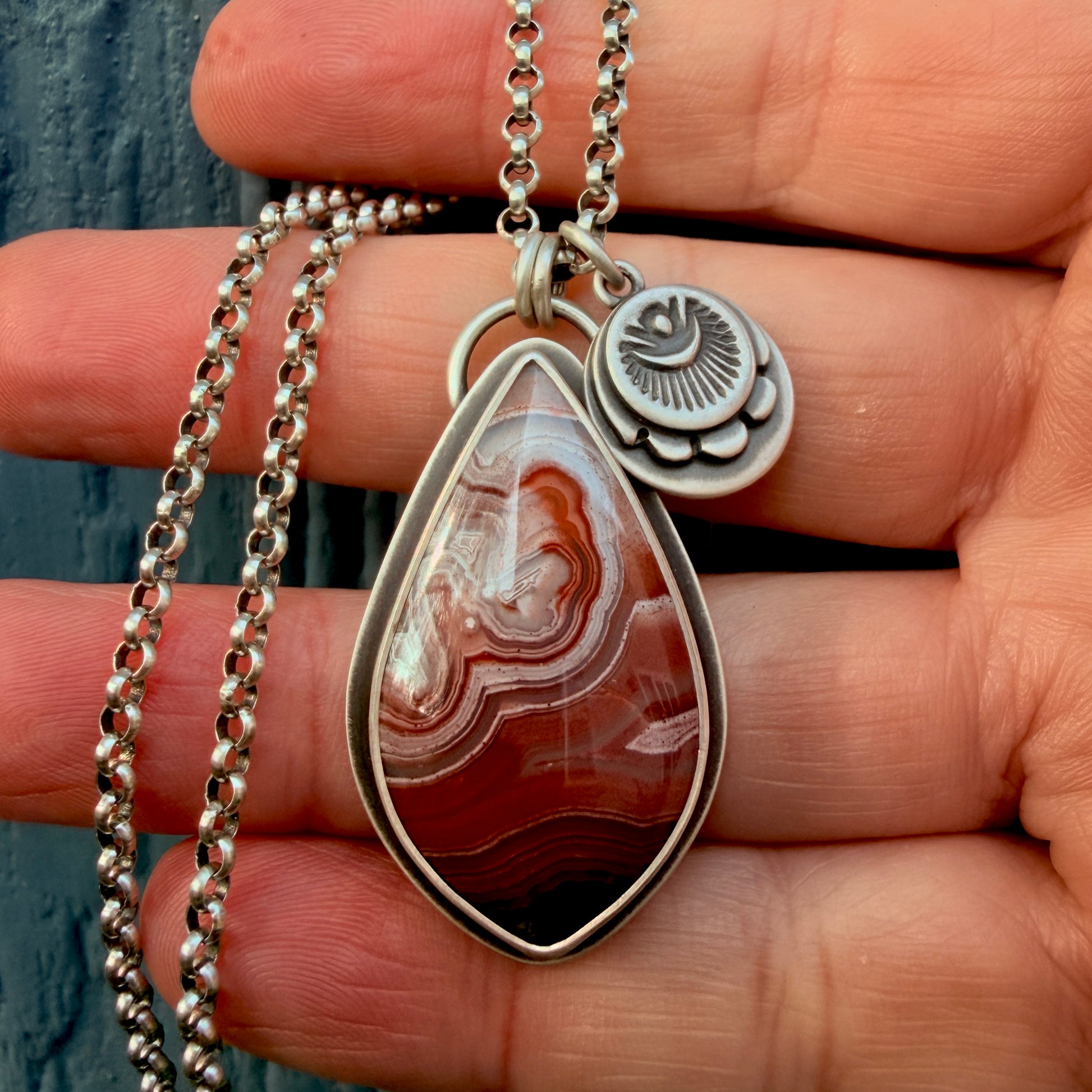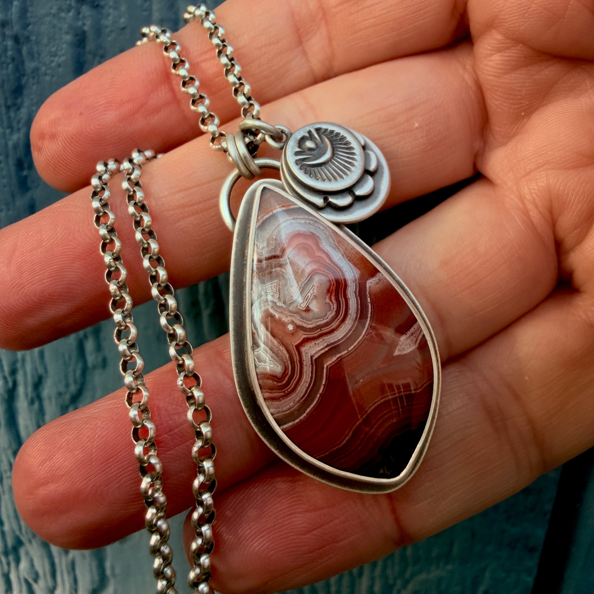 Each necklace in this collection is entirely handmade from start to finish, this one features a one of a kind Laguna lace agate set into sterling and fine silver. The medallion gives this piece a little extra character. No two will ever be exactly alike as they are individually hand stamped and made with layers of sterling silver sheet.