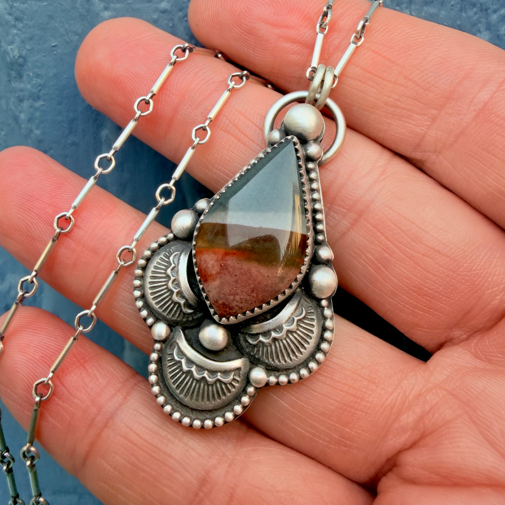 Set in fine and sterling silver, layered stamped elements and silver granules echo the stone’s natural rhythm. The elongated teardrop shape adds elegance while maintaining a strong, earthy presence.