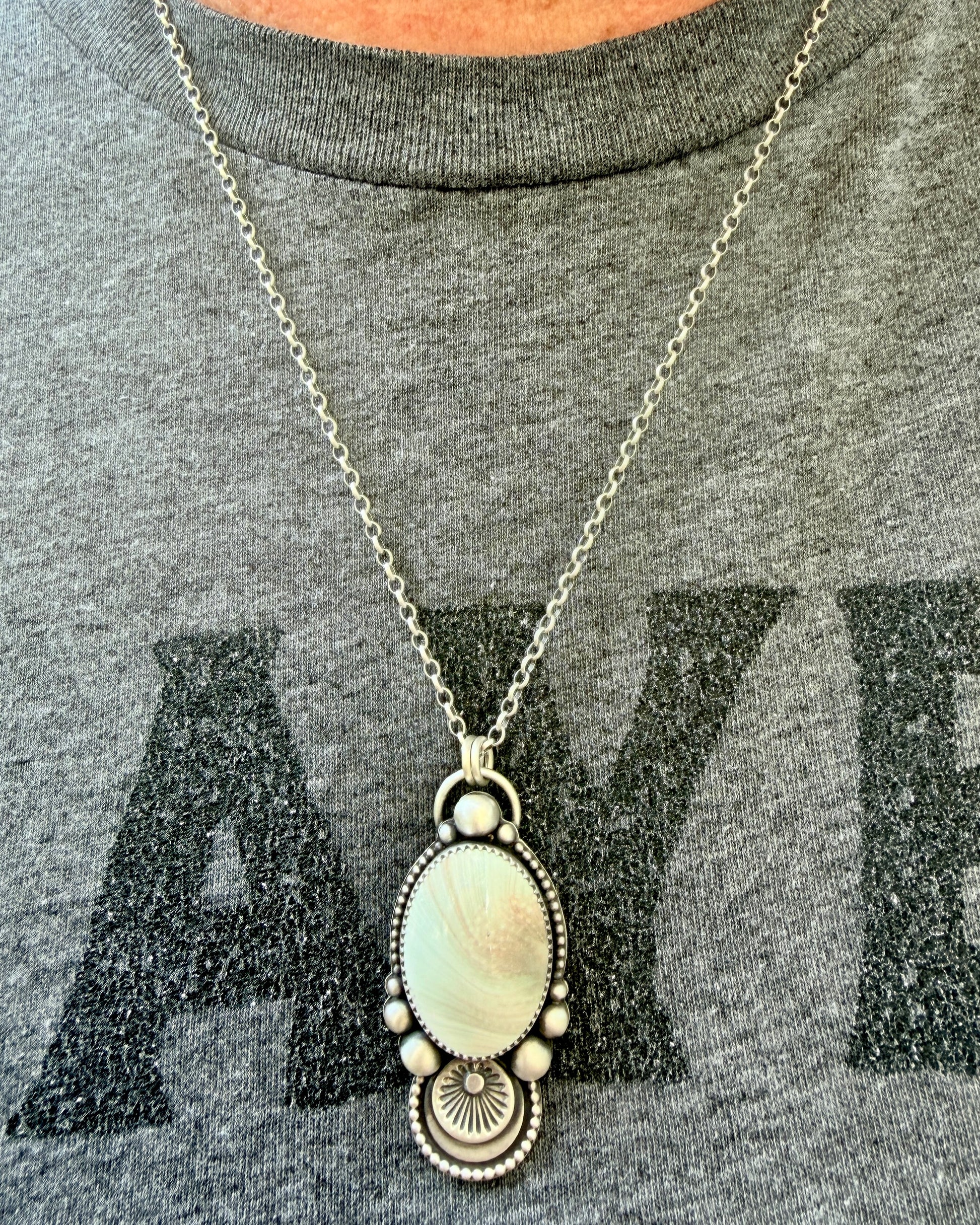 Suspended from a 20” sterling silver oval rolo chain, this piece sits comfortably at the chest and pairs beautifully with other turquoise pieces you may have in your collection.